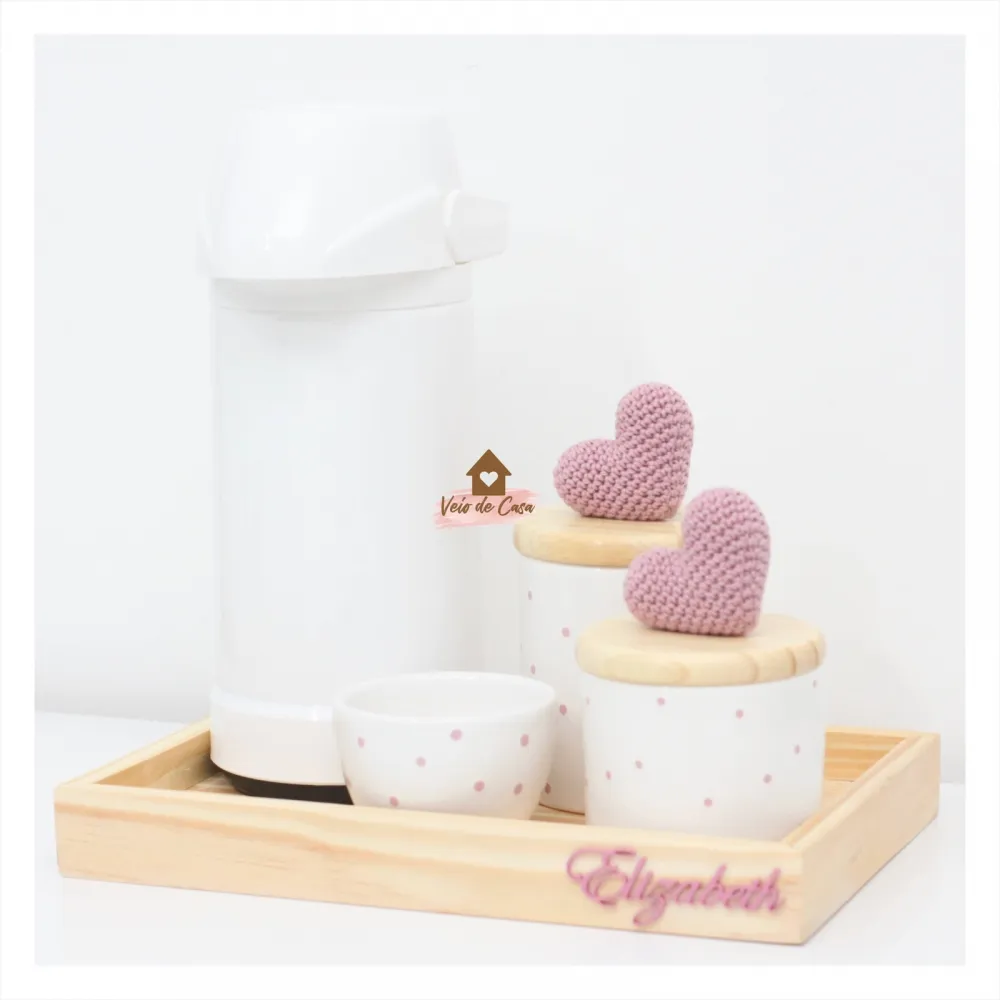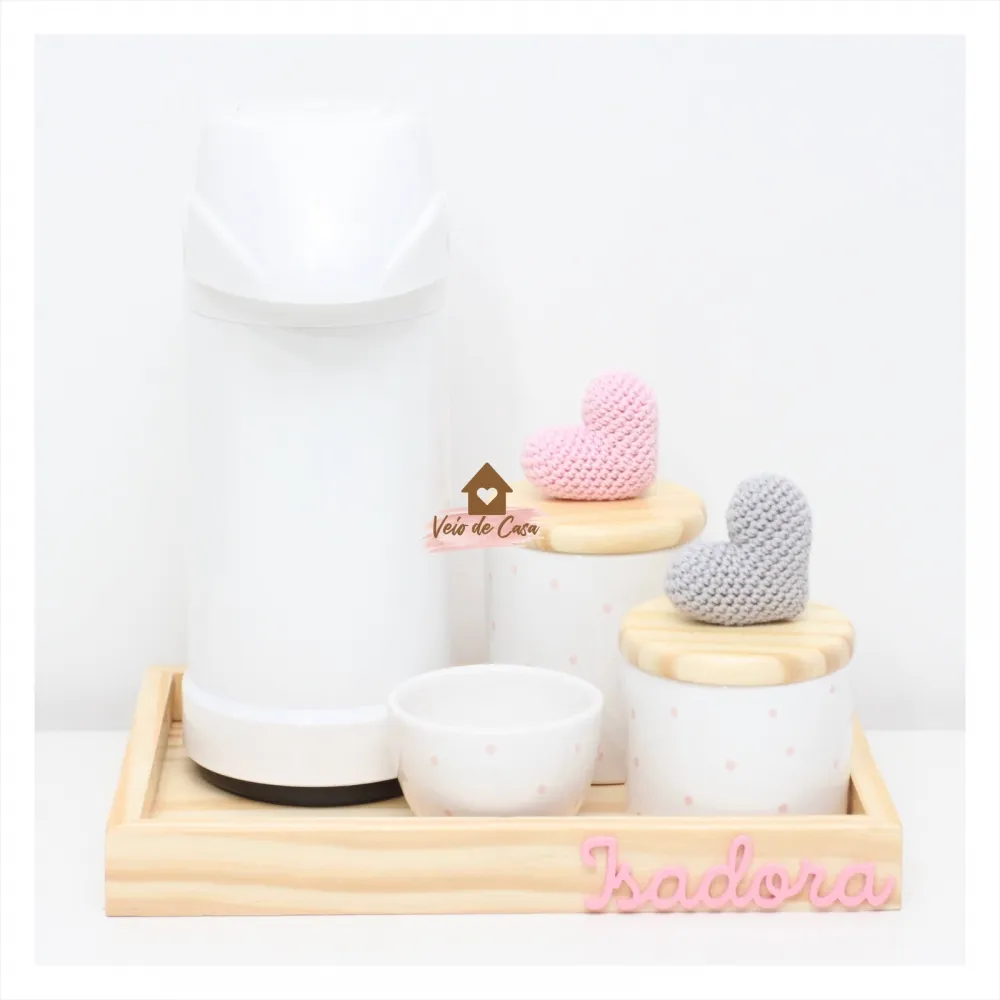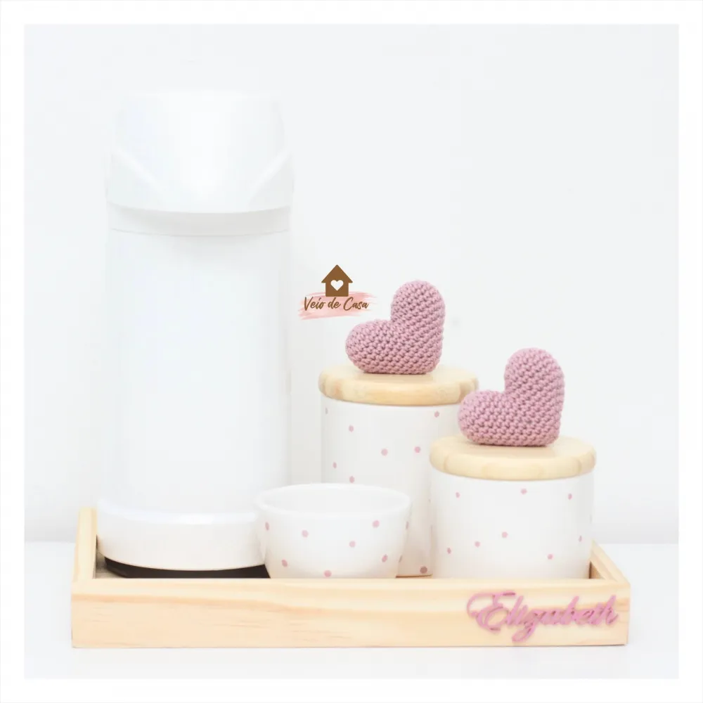 Corações - Kit Higiene Poá - 5 peças - Bandeja Madeira - Garrafa G