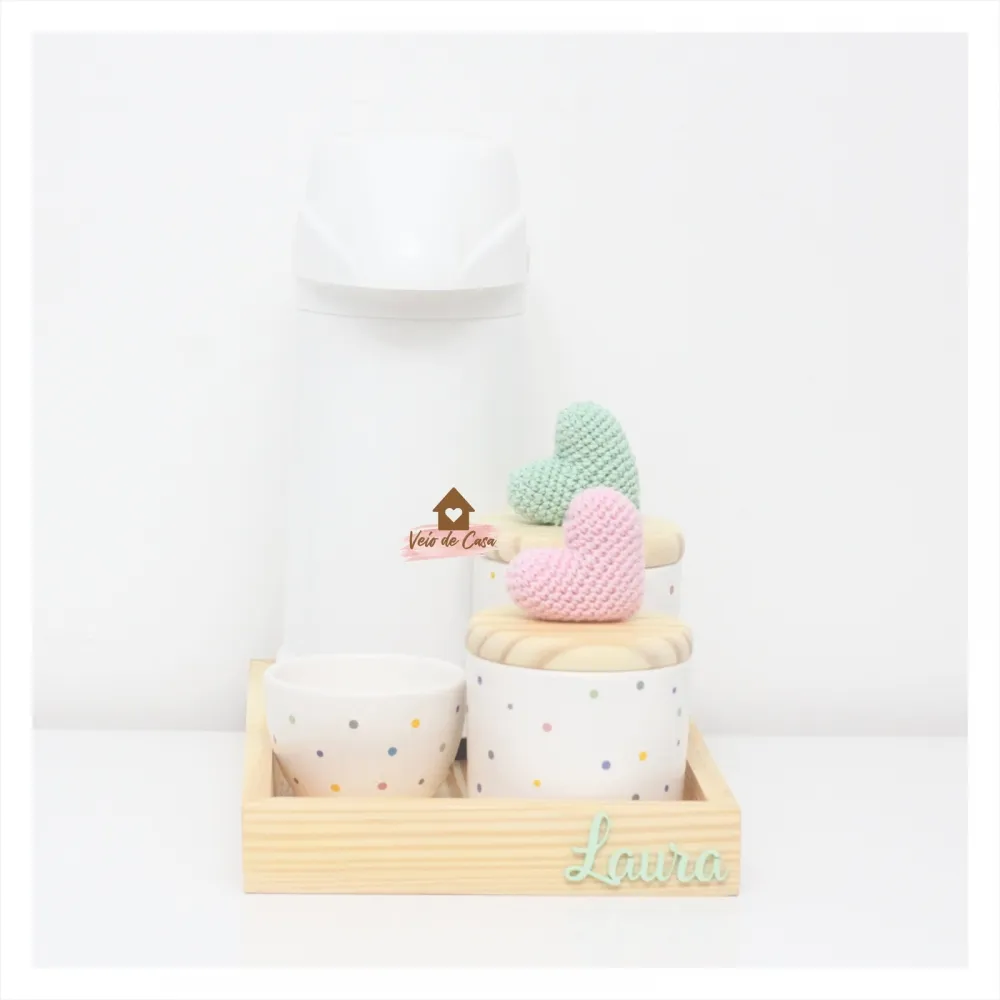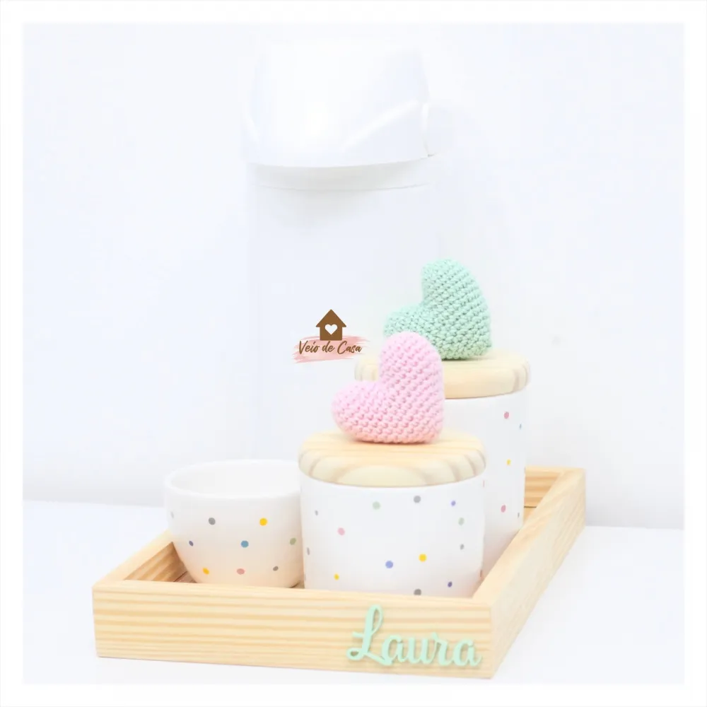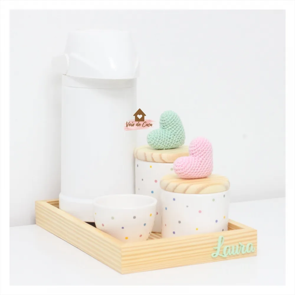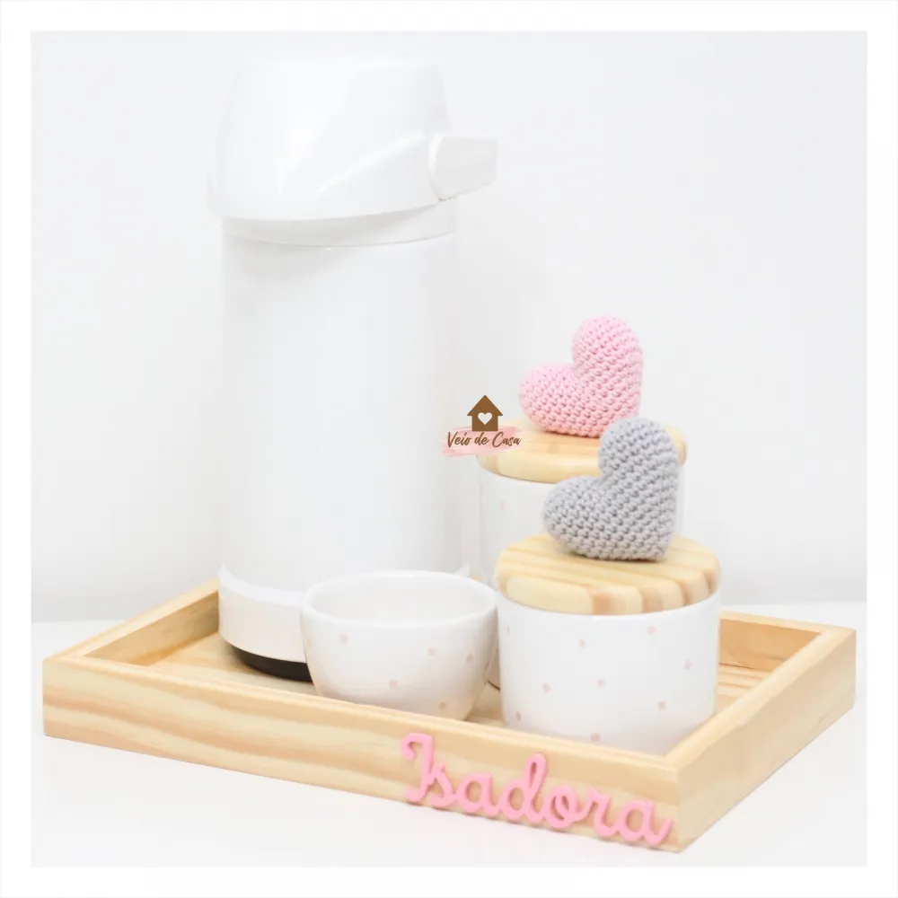 Corações - Kit Higiene Poá - 5 peças - Bandeja Madeira - Garrafa G