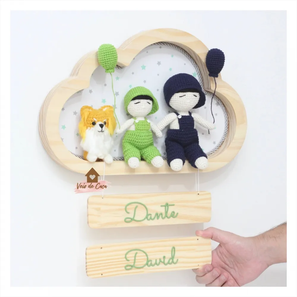 Enfeite com uma plaquinha, com nome do bebê, para a porta da maternidade. Acompanha outra plaquinha solta, com o nome do irmão mais velho, para a porta do quarto.