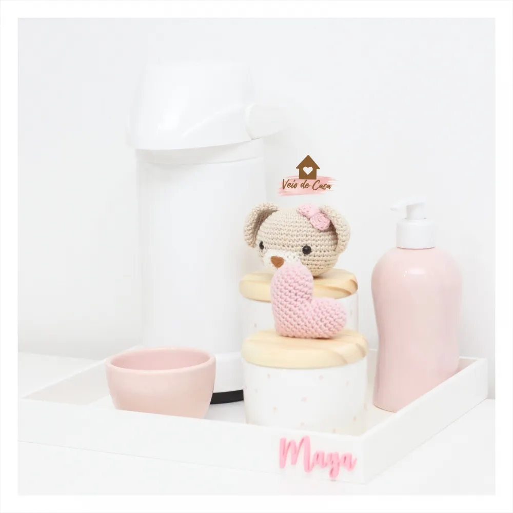 Ursinha + Coração - Kit Higiene Poá - 6 peças - Poá - Bandeja Madeira - Garrafa G